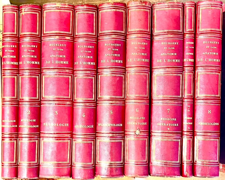 Monumental ouvrage du chirurgien et anatomiste Jean-Marc Bougery, publié sous la direction de Claude Bernard, illustré de 750 planches lithographiées, la plupart en couleurs. Deuxième édition augmentée du plus important et du plus beau traité d'anatomie du XIXe siècle, paru pour la première fois de 1832 à 1854. Divisé en quatre parties (l'anatomie descriptive, chirurgicale, générale et philosophique), il comporte les volumes suivants: ostéologie et syndesmologie (t.1); myologie et aponévrologie (t.2); névrologie (t.3); angéiologie (t.4); splanchnologie (t.5); médecine opératoire (t.6, t.7 et Supplément); embryologie (t.8). La partie consacrée à la médecine opératoire, ajoutée dans cette deuxième édition, a été rédigée sous le contrôle de Claude Bernard. Cette nouvelle édition enrichie de planches supplémentaires ne comprend pas de frontispice.Bourgery (1797-1849) consacra sa vie à cet ouvrage, pour lequel il s'associa au dessinateur et lithographe, Nicolas-Henri Jacob (1782-1871), élève de David. Cuvier, à qui l'auteur avait confié son projet dès 1830, trouva ce traité très réussi, notamment grâce à la lithographie dont l'emploi devint dès lors incontournable en anatomie. Bon exemplaire en dépit de quelques défauts d'usage à la reliure (petits accidents et frottements, petit manque de cuir au dos du tome 6), quelques rousseurs et traces de mouillure.Waller, 1372.