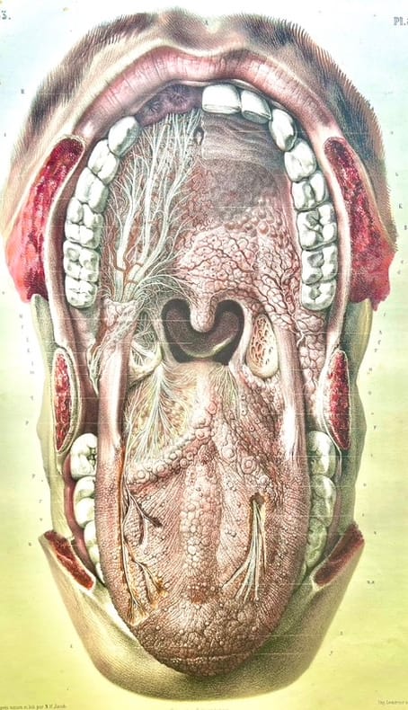 Album constitué de 93 planches lithographiées dont deux doubles, la plupart en couleurs, relatives à la dentisterie, extraites des tomes 1 à 8 du Traité complet de l'anatomie de l'Homme de Jean-Marc Bourgery et Nicolas-Henri Jacob (deuxième édition, 1866-1871).Bel exemplaire malgré quelques rousseurs, traces de frottement.