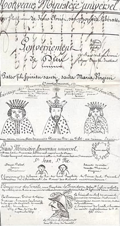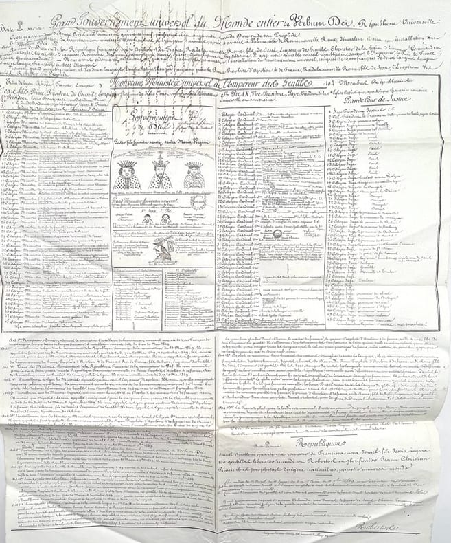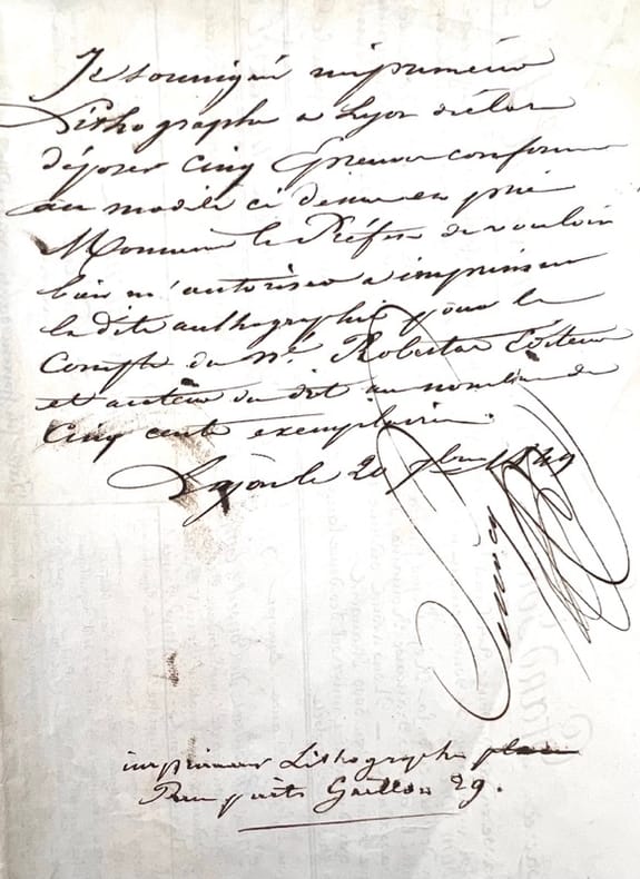 Appel à l'installation du Gouvernement universel à Lyon en 1849. « Au nom de Dieu et de la République française santi Apoléon 4 de France, Roi de la nouvelle Rome, fils de Jessé, Empereur des Gentils, Chevalier de la Légion d'honneur, Commandant général de toutes les armées Française, Romaine, Italienne, Piémontaise, Savoie, Suisse, Autrichienne et Gentillienne, avec notre aimable conseil républicain, savoir : l'Empereur, le Roi, le Prince, les deux Ambassadeurs. Nous avons ordonné et ordonnons ce qui suit : savoir la nomination, l'installation du Gouvernement universel composé de 10000 français de deux langues, langue latine et langue française, et 5000 étrangers. Nouveau grand ministère universel des deux langues, langue latine, langue française pour le Prince Prophète d'Apoléon 4 de France, Roi de la Nouvelle Rome, fils de Jessé, l'Empereur des Gentils, Robertos son Prophète ».Pièce très rare imprimée par Jacques-Nicolas Senocq accompagnée au verso d'une demande autographe signée pour obtenir l'autorisation du préfet de Lyon, pour la reproduction en 500 exemplaires de cette affiche étonnante : Je soussigné lithographe à Lyon déclare déposer cinq épreuves conformes au modèle ci derrière, prie Monsieur le Préfet de vouloir bien autoriser à imprimer la dite autographie pour le compte de Mr. Robertos éditeur et auteur dudit au nombre de cinq cents exemplaires. Loyn, le 20 7bre 1849. Senocq imprimeur lithographe Rue Puits Gaillot 29.Professeur d’écriture et sténographe, Jacques-Nicolas Senocq était employé à la Mairie de Lyon et demeurait rue Sirène (rue Lanterne) lorsqu’il créa son atelier, en 1853. Celui-ci fut autant et plus encore une lithographie qu’une imprimerie en caractères. Senocq était d’ailleurs ouvrier sur pierre et travaillait dans l’imprimerie Rey et Sézanne, rue Saint-Côme 2, quand, en 1850, il épousa la fille d’Antoine Ronet, associé de François Dumoulin. Il avait été reçu imprimeur typographe en 1852 lorsqu’il s’établit au numéro 16 de la rue Centrale. La même année, il est domicilié rue Puits-Gaillot 29, puis rue Centrale 20 en 1854.En 1855, 1856 et 1857, l’Almanach de Lyon le signale encore mais sans lui donner d’adresse, et en 1859, une liste d’imprimeurs le dénonce cours de Brosses (cours Gambetta). Senocq, venu de la Moselle, éditait de la poésie, des chansons et de la musique. (Musée de l'imprimerie de Lyon)Un seul exemplaire au Worldcat (BnF). Brunet, Les Fous littéraires, p. 174 ("Roberts") ; absent de Blavier.