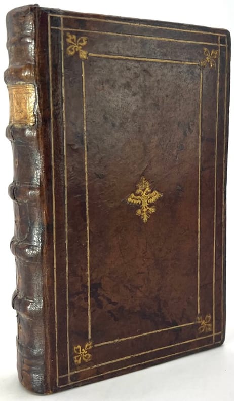 Poitiers, Jehan et Enguilbert de Marnef à l'enseigne du Pélican , 1545. In-8 de (22)-219 ff., table, caractères italiques, veau brun marbré, dos orné à nerfs, pièce de titre en maroquin fauve, triple filet doré d'encadrement sur les plats, aigle couronné à deux têtes au centre des plats, tranches dorées (reliure de l'époque).
