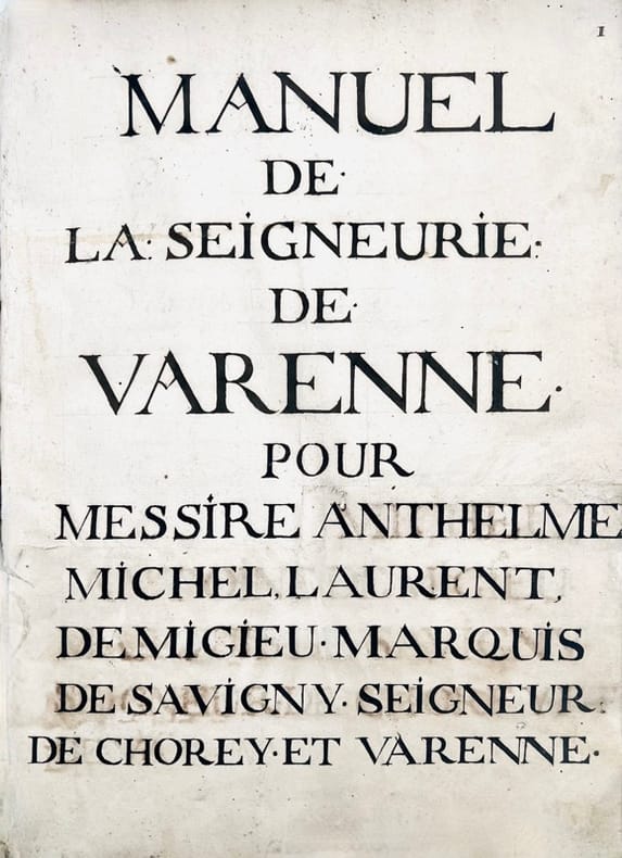 Précieux inventaire des biens de la seigneurie de Varennes en Bourgogne dont le château de Savigny-lès-Beaune, propriété depuis 1752 du bibliophile et collectionneur bourguignon Anthelme-Michel-Laurent de Migieu, chevalier de Saint-Louis, marquis de Savigny, seigneur de Chorey et de Varennes, dernier représentant de la lignée dont le nom est attaché à la fois à un considérable agrandissement du domaine et à la création d'une exceptionnelle collection d'antiquités du monde entier.État nouveau donné en 1759 des biens de la Seigneurie de Varenne, avec nouveaux confins. Le Château de Varenne appelé le Château dessur (sic), fossé, cour, jardin, chenevière, grange, aisance et dépendance contenant le tout vingt deux ouvrées vingt neuf Perches tenant d'Orient à une terre qui était vigne de mondit seigneur d'occident à la rue tenant aux moulins et à la Tuilerie de Midi à la chenevière de Mr Déchamps et de septembre à la maison et jardin de François Cler. Cette terre de Savigny érigée plus tard en marquisat, entra dans la Maison de Migieu qui possédait fiefs en Bourgogne, en Bugey et en Franc-Lyonnais, par suite de l'acquisition qui en fut faite par Antide de Migieu, président à mortier au Parlement. Il l'acheta, en 1689, du Président Bénigne Bouhier. En 1718, elle appartenait à Abraham-François de Migieu, son fils ; en 1719 à Abraham-Guy de Migieu, conseiller au parlement de Bourgogne.« Anthelme-Michel-Laurent de Migieu (1723-1788), issu d'une famille qui possédait des fiefs en Bourgogne, en Bugey et en Franc-Lyonnais, était le fils d'un président à mortier au parlement de Dijon [… ]. Officier aux Gardes-françaises, chevalier de Saint-Louis, Anthelme de Migieu avait abandonné sa charge avant 1760, peut-être pour se consacrer exclusivement à ses curiosités. Il partageait son existence entre Paris, où il s'était marié en secondes noces, et la Bourgogne, ayant rassemblé ses collections de sceaux, d'archéologie gallo-romaine et de manuscrits dans son château de Savigny, près de Beaune [… ]. Le seul ouvrage qu'il semble avoir publié est un Recueil de sceaux gothiques imprimé à Paris en 1779 » (Yann Sordet, L'Amour des livres au siècle des Lumières. Pierre Adamoli et ses collections, Paris, École des Chartes, 2001, p. 298). Reliure tachée, sans les lacets.Henri Omont, « Un bibliophile bourguignon au XVIIIe siècle : la collection de manuscrits du marquis de Migieu au château de Savigny-lès-Beaune », Revue des bibliothèques, t. XI, 1901, p. 235-283.