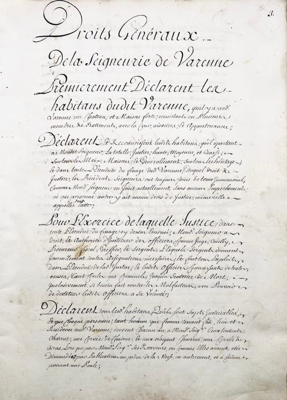 Varennes, , 1759. In-folio manuscrit (37,5 x 27,5 cm) de 151 pp., vélin de réemploi (antiphonaire), traces de lacet (reliure de l'époque).
