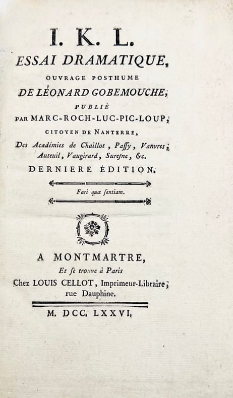 Édition originale de cette facétie en forme de pièce de théâtre dont tous les dialogues se composent de lettres de l’alphabet, non assemblées entre elles, et les écrivains auxquels l'auteur fait allusion ne sont désignés que par des initiales ou par périphrases. Romancier et auteur dramatique, Villemain d’Abancourt (1745-1803) adresse l’épître dédicatoire “À mon cordonnier” et ne cesse de railler impitoyablement la plupart des auteurs mineurs de son temps : Fréron, l’abbé Nonotte, Mercier, etc. Il était également collectionneur si on en croit la notice nécrologique du Nouvel Almanach des muses : « Villemain d’Abancourt avait un goût particulier pour le genre dramatique. Dans le choix de sa bibliothèque, il avait pris le soin minutieux de ne laisser échapper aucune pièce de théâtre : avaient-elles plusieurs éditions ? il se les procurait toutes ; n’étaient-elles point imprimées ? il tâchait d'en avoir le manuscrit. La collection qu'il en a faite est très nombreuse, et excessivement rare ; il serait à désirer que quelque riche amateur voulût en faire l'acquisition, dont le prix, quel qu'il puisse être, n'approchera jamais de celui que d'Abancourt y a consacré. »Viollet-le-Duc, Bibliographie des chansons, fabliaux, facéties, 1859, p. 205 ; Drujon, Les Livres à clefs I, 1888, pp. 484-485 ; Arthur Dinaux, Les Sociétés badines, bachiques, littéraires et chantantes, 1867, p. 374.