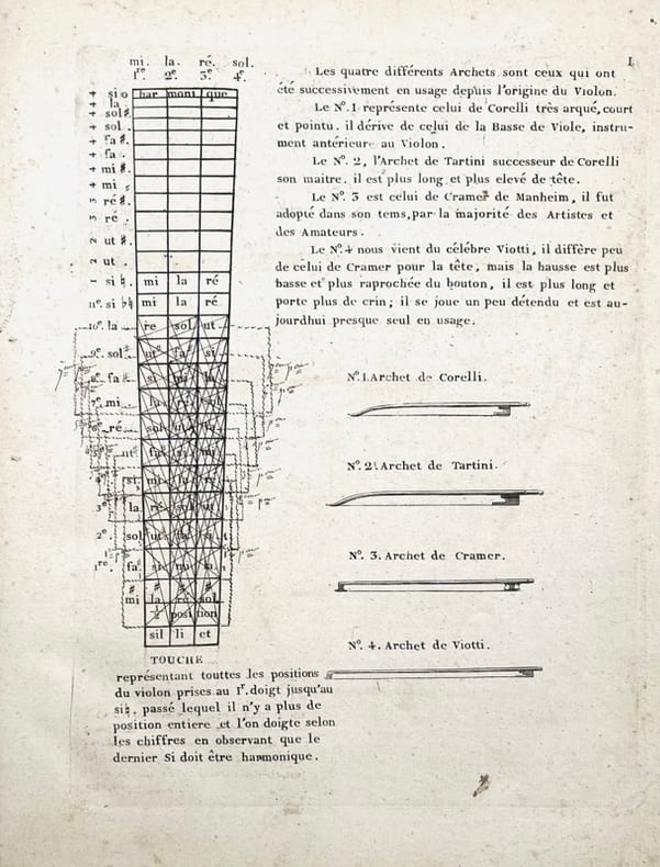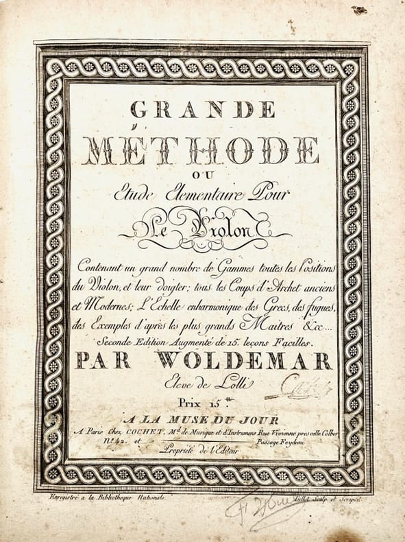 Deuxième édition augmentée, entièrement gravée (texte et musique) par Van Ixem, graveur de musique actif à partir de 1794, ornée d'un titre dessiné et gravé par Billet. Orléanais né la 17 juin 1750, mort le 19 décembre 1815 à Clermont-Ferrand où il exerça les fonctions de maître de Chapelle, Michel Woldemar fut un violoniste qui posséda une expérience réelle de l'alto. Se réclamant de l'école d'Antonio Lolli (1725-1802), Woldemar consacra l'essentiel de son oeuvre pédagogique au violon avec une oeuvre majeure, sa Grande méthode ou étude élémentaire pour le violon publiée une première fois à Paris chez Cochet en 1798. « Avec cette méthode, il conçoit un ouvrage qui se place rapidement à un niveau technique très élevé et assez inhabituel dans le répertoire didactique de l'alto. » (Corpus pédagogique pour l'alto, De Corrette (1773) à Elwart (1844), choix, introduction et notes par Frédéric Lainé, Sprimont, Mardaga, 2002).Cachet ex-libris ancien au titre, exemplaire annoté à l'encre du temps (feuillets liminaires), ex-libris manuscrit postérieur au crayon « F. Huez ». Pâle mouillure marginale, quelques renforts de papier sur les premiers et derniers feuillets, rousseurs au titre.Fétis, VII, p. 486.