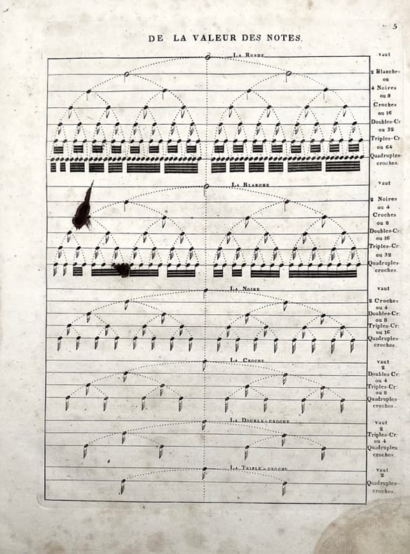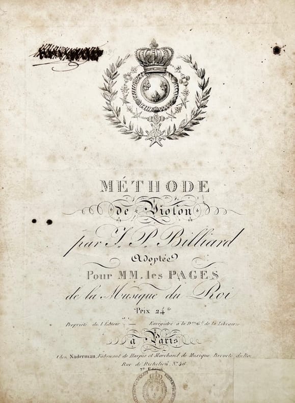 Remise en vente de l'édition originale avec mention de deuxième édition au titre et cachet de l'éditeur, entièrement gravée (texte et musique).Une des premières méthodes remarquable pour l'illustration du paragraphe sur la tenue du violon, comprenant quatre figures représentant le jeune musicien, l'instrument et la position de la main. « On tient le Violon de la main gauche entre le pouce et l’index ; il se place sur la clavicule, et le menton appuyé sur la joue gauche du violon : on doit le tenir assez fortement pour que la main puisse parcourir librement l’étendue du manche. Il faut élever la main de manière que le manche soit à la hauteur de l’épaule, tenir le coude un peu en dedans et dégager le poignet de façon que le manche ne touche point la paume de la main. Voyez la figure 1 ». Jean Philibert Billiard (1757-18..), compositeur, fut professeur de français puis directeur de lycée sous la Constituante (1790-1792). Ex-libris manuscrit biffé à l'encre du temps. Pâles rousseurs et mouillures, titre sali, plusieurs feuillets restaurés dont le titre et la dédicace. Absent de Fétis.