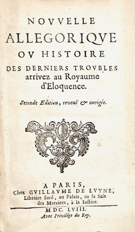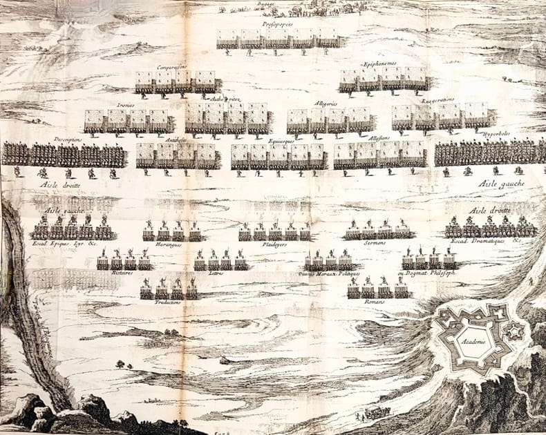 Deuxième édition rare publiée l'année de l'originale. Superbe carte allégorique gravée en taille douce qui illustre sur fond de champ de bataille le combat rhétorique du classicisme français contre l'Académie assiégée par une armée dont les différents bataillons se nomment Romans, Harangues, Traductions, Hyperboles, Équivoques, Descriptions, Allégories, Ouvrages moraux politiques, etc. « Cet ouvrage spirituel et piquant renferme une foule de particularités curieuses sur l'histoire littéraire de l'époque où il a été écrit. Il y a plus de faits singuliers et notables dans ce petit volume qu'on n'en trouveroit dans cinquante ouvrages anecdotiques du même temps » (Nodier, Description raisonnée, 1030).Bon exemplaire. Quelques rousseurs et feuillets brunis. Brunet, II, 1426 ; Tchemerzine, III, 393.