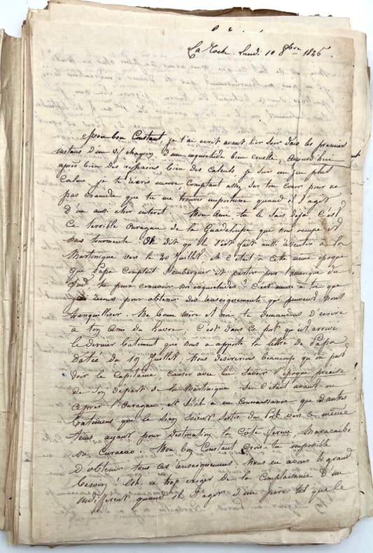 Correspondance au long cours des familles Massion et Berneval, armateurs et négociants à Nantes et sur l'Île Bourbon au XIXe siècle. Cet ensemble de lettres à caractère familial, principalement rédigée par Mlle Cythie Berneval entre 1822 et 1870 (†), est exclusivement adressé à son cousin « Mr Constant Massion chez Mr Gicquel aîné négociant à Nantes » qui sert de messager - les noms des navires (« La Sémillante », « La Jeune Mathilde » etc.) chargés du transport du courrier sont précisément consignés : « Je t'enverrai une lettre pour mon bon père mais si d'ici là un navire partait, je t'en prie mon bon ami charge le de quelques lignes qui tranquilliseraient ce bon père et lui permettent une prochaine lettre de moi. Je tiens beaucoup à ce que tu fasses partir le plus tôt possible mon petit mot du jour ». Les patronymes Massion et Berneval sont attachés à la ville de Nantes dès le XVIIIe siècle comme armateurs et pour le second à l'île de la Réunion selon la correspondance expédiée à partir de 1837 de Saint Denis de Bourbon, Bras-Panon, Champ Borne Saint André. « Le port de Nantes devint l'un des principaux ports du royaume de France. Les négociants nantais investissent alors massivement dans la traite. (…) la Constance décharge à Nantes en 1822 plusieurs produits venus de Santiago de Cuba à la consignation de Louis Massion et fils, armateurs, dont 68 balles de coton à leur requête (Adla, feuille commerciale de Nantes, le 20 novembre 1822). La même année, Louis Massion et fils sont responsables de l’armement de deux négriers à destination de Santiago de Cuba, la Dryade et la Félicie » (Bernardo Monnerat, L’Atlantique et Nantes à l’époque de la traite illégale vers Cuba, 1789-1831).Joël Rilat, Ces Messieurs de Nantes, 2018, tome III, p. 108 (Massion et Berneval).