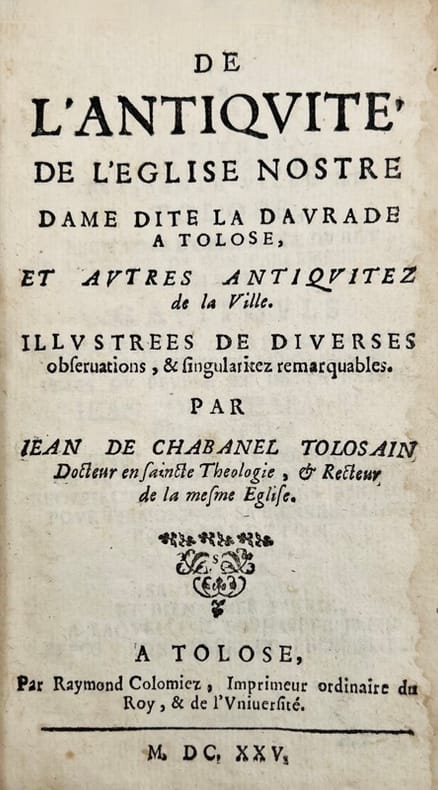 Deuxième édition de l'histoire de l'église toulousaine Notre-Dame de La Daurade écrite et publiée une première fois en 1621 par son recteur Jean de Chabanel (Toulouse 1560-1615).Édition originale de l'« État et Police » de ladite église. La tradition évoque un temple romain transformé en église chrétienne dédiée à la Vierge Marie, avec des mosaïques à feuille d’or, d’où le nom de « Deaurata », « la Dorée », la Daurade. « Souvent placée sous l’égide des rois wisigoths, l’ancienne église de la Daurade, avec ses resplendissantes et fameuses mosaïques à fond d’or, s’inscrivit-elle aussi dans ces vastes chantiers toulousains du Ve siècle ? De nombreuses pages furent déjà écrites sur cet édifice du temps où il était visible, avant sa destruction entreprise en 1761. C’est d’elles et de quelques documents graphiques que dépend la connaissance que nous en avons. Son statut souvent affirmé de plus ancienne église mariale des Gaules, qui aurait été élevée après le concile d’Éphèse de 431, permettrait de situer sa construction sous les rois wisigoths de Toulouse. Depuis Jean de Chabanel en 1625, on essaya d’identifier lequel de ces rois ou reines commanda ou finança son édification. » (Daniel Cazes, « La question de l’art wisigothique dans le Royaume de Toulouse », Pallas, 114 | 2020, 305-325).Très bon exemplaire. Feuillet de dédicace imprimé en lettres capitales « à la très ancienne, religieuse et puissante ville de Toulouse (…) ».Brunet, Supplément I, p. 239 (édition originale).