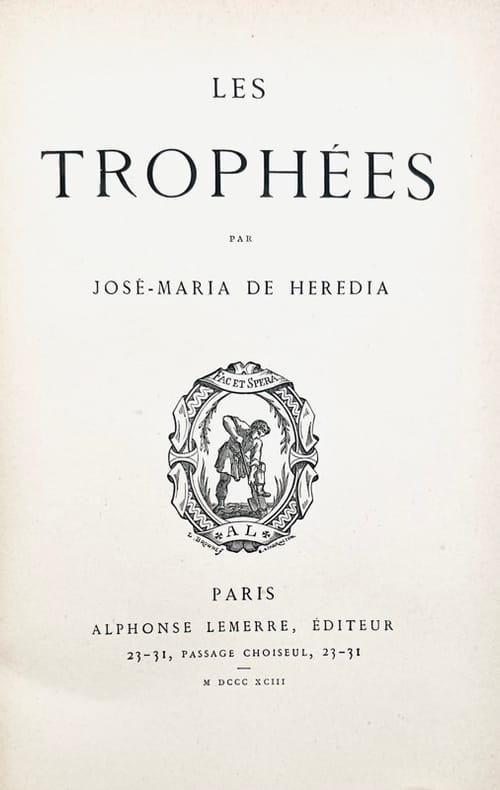 Première édition in-12 publiée l'année de l'originale.Seul recueil de poésie de Heredia paru, composé presque tout entier de sonnets, il se divise en plusieurs groupes : la Grèce et la Sicile, Rome et les Barbares, Moyen âge et Renaissance, Orient et Tropiques, la Nature et le Rêve ; il est le dernier sommet du mouvement parnassien. Ex-libris Ronnie Binehof.Vicaire, IV, col. 72.