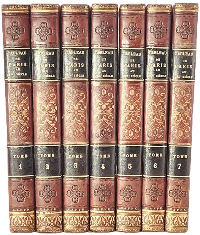 Unique édition de ce très intéressant recueil de notices thématiques (par exemple, les réverbères de Paris, les bibliothèques publiques, les prisons, les hôtels garnis, les demoiselles à marier, etc.), couvrant toutes les activités de la capitale. Avec des contributions de Léon Gozlan, Paul de Kock, Louis et Charles Reybaud, Alphonse Karr, Auguste Luchet, Maurice Alhoy, Achille de Vaulabelle, Jules Janin, Frédéric Soulié, Paul Lacroix, Henry Martin, Augustin Jal, Félix Pyat, Hippolyte Fortoul, Balzac, Gustave Planche, Philarète Chasles, Eugène Briffault, Frédéric de Courcy, Théodore Muret, Jacques Arago, etc.I. [2] ff. n. ch., 390 pp., un f. n. ch. de table. - II. [2] ff. n. ch., 408 pp., manque le feuillet de table. - III. [2] ff. n. ch., 374 pp., un f. n. ch. de table. - IV. [2] ff. n. ch., 384 pp. - V. [2] ff. n. ch., 404 pp., un f. n. ch. de table. - VI. [2] ff. n. ch., 393 pp., un f. n. ch. de table. - VII. [2] ff. n. ch., 367 pp., un f. n. ch. de table.Vicaire VI, 240-241.Exemplaire du grand collectionneur parisien Edgar Mareuse (1848-1926), avec belle vignette ex-libris gravée par Adolphe Lalauze.Vignette ex-libris Yves-Louis Mongrolle. - - VENTE PAR CORRESPONDANCE UNIQUEMENT