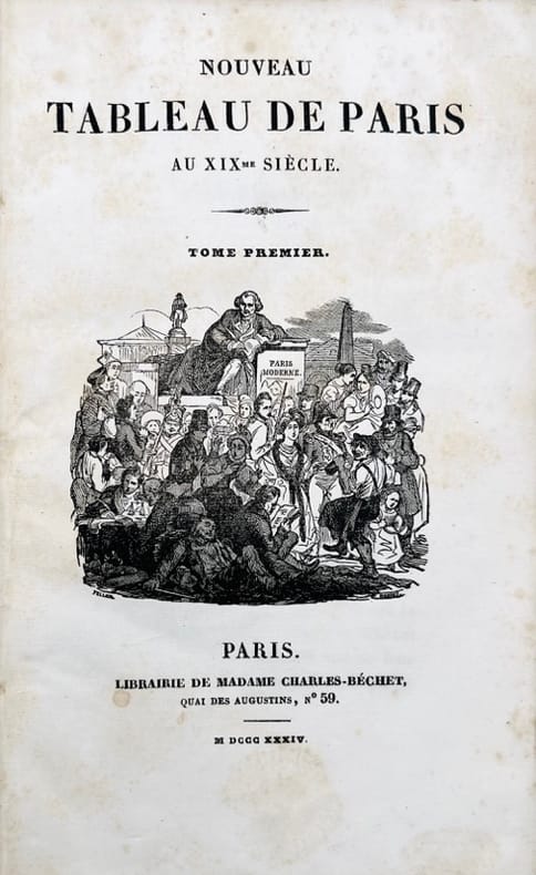 Édition originale de ce recueil collectif.« La publication a été inspirée par le succès que venait d'obtenir, peu auparavant, Paris ou Le Livre des Cent-et-un, 1831-1834. Le Nouveau Tableau de Paris n'est pas moins important ni moins intéressant que son devancier. On remarque parmi les collaborateurs plusieurs écrivains de valeur » (Lacombe).Les notices contenues sont de Honoré de Balzac, Henry Martin, Léon Gozlan, Paul de Kock, Louis Reybaud, F. Davin, Émile Deschamps, Alphonse Karr, Auguste Luchet, Charles Reybaud, Maurice Alhoy, Michel Raymond, d'Antonnelle, Achille de Vaulabelle, Ernest Desprez, Théodore Muret, Altaroche, N. Brazier, Frédéric Soulié, Richard, Félix Pyat, Michel Masson, Albert des Étangs, A. Jal, P.-L. Jacob, Duverger, Jules Janin, Cordelier-Delanoue, Édouard Monnais, Samson, James Rousseau, Merville, J. Anthony, L. Huart, H. Fortoul, Gustave Planche, Raymond Brucker, Charles Didier, Ad. Jubinal, Philarète Chasles, Bert, Eugène Briffaut, Frédéric de Courcy, Bertheaud, Prosper Lucas, Charles Dégleny, Pigault-Lebrun, Chabot, J. Arago, Gaussuron-Despréaux, Alph. Leclerc, Durocher, Mnneville et P.-L.-B. Caffe.Vignette de Tellier gravée sur bois par Porret sur chaque feuillet de titre à partir du tome II.Bel exemplaire malgré des rousseurs. Provenance : Paul-Louis-Balthasar Caffe (1803-1876), médecin savoyard et érudit, collaborateur du présent ouvrage.Lacombe, Bibliographie Parisienne, 695 ; Vicaire VI, 240.
