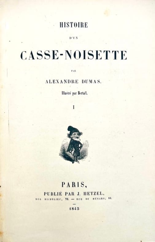 Édition originale et premier tirage des illustrations de Bertall. Une adaptation libre du conte pour enfants d’Hoffmann Nussknacker und Mausekönig : c’est la version de Dumas qui inspira à Tchaïkovky son ballet Casse-noisette.Bel exemplaire conservé dans son cartonnage romantique de l'époque. Quelques rousseurs.Vicaire III, 371 ; Carteret III, 446 ; Talvart, 78 ; Munro, 148.