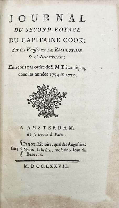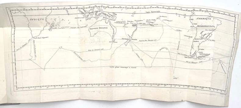 A AMSTERDAM ET SE TROUVE A PARIS. CHEZ PISSOT, LIBRAIRE. NYON, LIBRAIRE. 1777. IN-8 (13 X 20 X 4,5 CENTIMETRES ENVIRON) DE (4) + XIX + (1) ET 546 PAGES, RELIURE D'EPOQUE PLEIN VEAU MARBRE, DOS A CINQ NERFS ORNE DE CAISSONS A FLEURONS DORES, TITRE DORE SUR ETIQUETTE MAROQUIN ROUGE, TRANCHES ROUGES. SANS LA CARTE. PREMIERE RELATION FRANCAISE DU SECOND VOYAGE DE COOK, PUBLIEE DIX-HUIT MOIS AVANT L'EDITION OFFICIELLE, ET CONTENANT DES DETAILS QUI NE SERONT PAS REPRIS DANS LES EDITIONS POSTERIEURES. L'AUTEUR DE CETTE RELATION, JOHN MARRA, CANONNIER A BORD DU VAISSEAU "LA RESOLUTION", AVAIT DU PUBLIE SON OUVRAGE ANONYMEMENT, LE REGLEMENT DE L'AMIRAUTE INTERDISANT AUX MEMBRES DES EXPEDITIONS D'UTILISER LE JOURNAL DE BORD A LEUR PROFIT PERSONNEL. PETITS DEFAUTS EXTERIEURS, DONT MORS INFERIEUR, SINON BON EXEMPLAIRE.