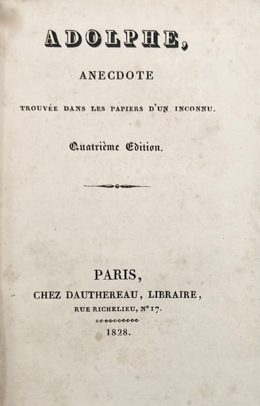 Dernière édition publiée du vivant de l’auteur (†1830). Le 20 décembre 1828, la Bibliographie de la France annonce la quatrième édition d’Adolphe établie sur la troisième dont « il ne semble pas que Constant ait suivi de fort près le travail de l’imprimeur Firmin Didot à qui la réalisation du volume avait été confiée » (Paul Delbouille, Genèse, structure et destin d’Adolphe, Presses universitaires de Liège, 1971). Bel exemplaire.Vicaire II, 932 (édition originale de 1816).