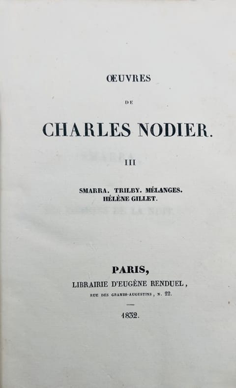 Oeuvres de Charles Nodier, tome III, publié chez Eugène Renduel. Comprend : Smarra, Trilby, Hélène Gillet, Mélanges.Bel exemplaire. Vicaire III, 175.