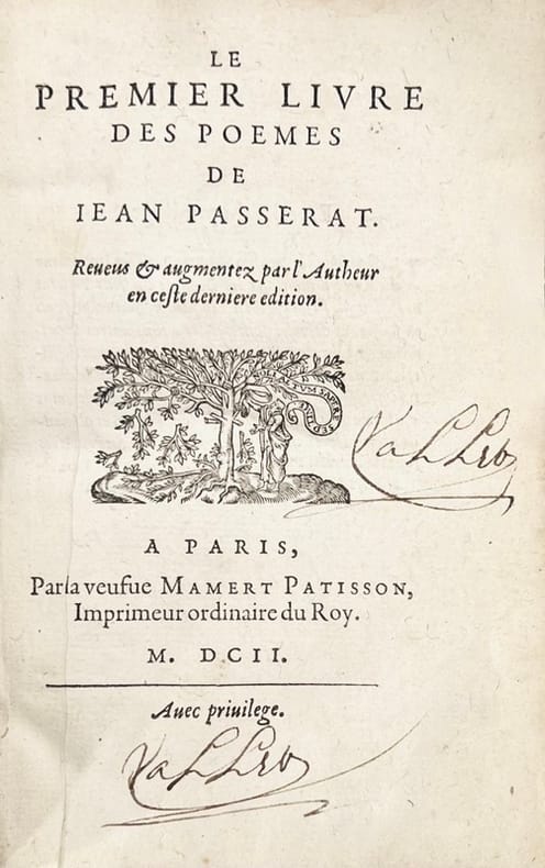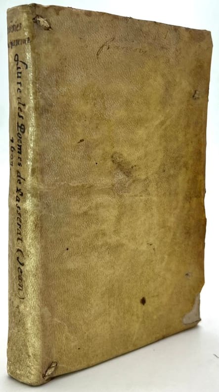 Dernière édition en partie originale publiée du vivant de Passerat (1534-1602) du Premier livre de poemes paru une première fois en 1597, joint au recueil de poésies latines Kalendæ januariæ, et varia quaedam poëmatia, les deux parties imprimées chez le même éditeur. Le privilège est daté du premier août 1602. On y trouve les grands poèmes cynégétiques dont Le chien courant composé à l'instigation du roi Henri III, le Cerf d'Amour, Adonis ou la chasse au sanglier, Métamorphose d'un homme en oiseau, suivis d'élégies, d'un sonnet, d'odes. Ex-libris manuscrit au titre « Vahl(…) » ; ex-libris armorié XIXe qui porte la la devise « In labore requies ». Exemplaire sans le portrait gravé par Thomas de Leu ; petit accident au plat supérieur avec manque de peau. Tchemerzine V, 109 ; Brunet, IV, 417 ; Renouard, 193 ; Thiébaud, 713 ; Souhart, 368.