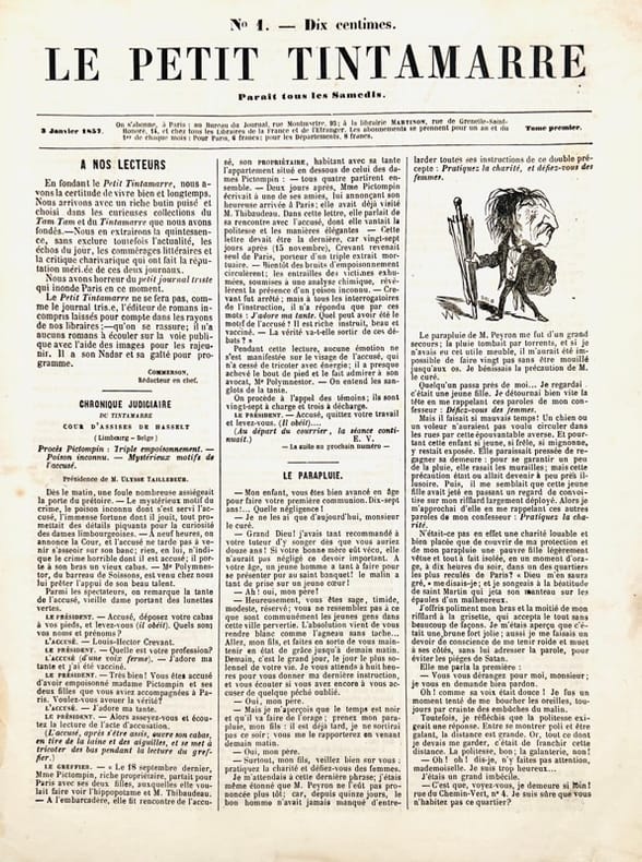 Collection complète, de toute rareté. Rédacteur en chef : Jean Louis Auguste Commerson (1802-1879). Revue créée à la suite du Tam-tam et du Tintamarre. Illustrations de Nadar et quelques Daumier.« Nous avons horreur du Petit journal triste qui inonde Paris en ce moment. Le Petit Tintamarre ne se fera pas, comme le journal triste, l'éditeur de romans incompris laissés pour compte dans les rayons de nos librairies ; - qu'on se rassure ; il n'a aucun roman à écouler sur la voie publique avec l'aide des images pour les rajeunir. Il a son Nadar et sa gaieté pour programme ».Grand-Carteret, p. 595. Très rare.