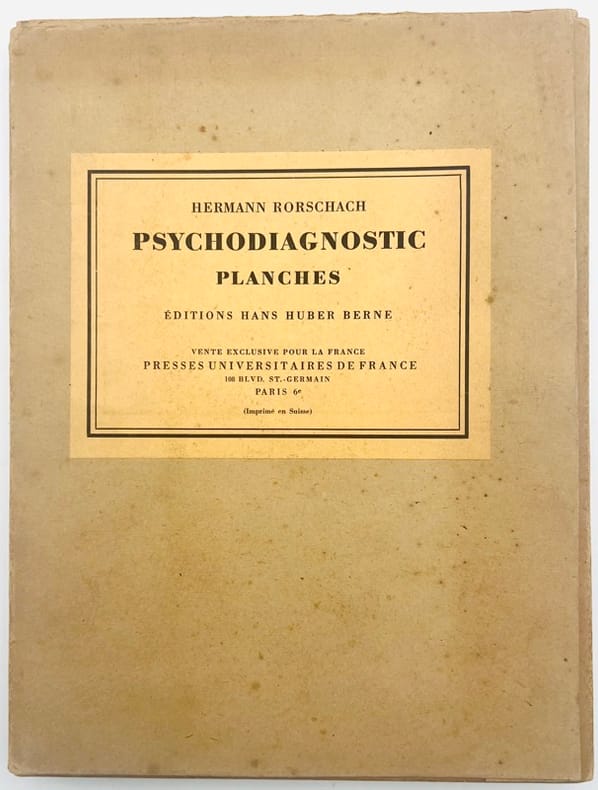 Berne-Paris, Hans Huber-Presses Universitaires de France, 1921, , 10 planches dont 5 en couleurs, chemise de couleur beige en cartonnage souple portant une étiquette jaune contrecollée sur le plat supérieur et imprimée en noire, Rarissime première édition des planches du test de Rorschach. Couverture tachée mais les planches sont en parfait état. Couverture rigide