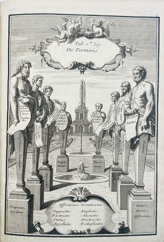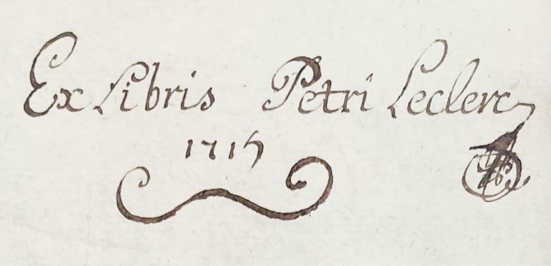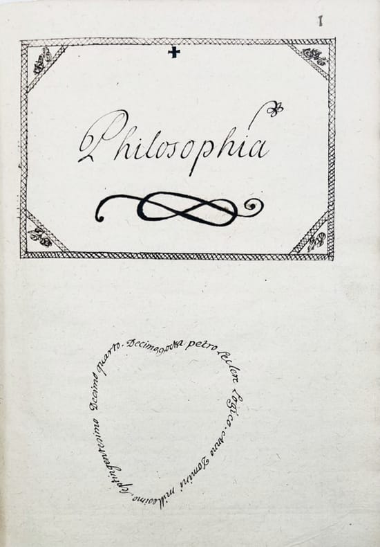 Cours de philosophie manuscrit contenant la Logique, la Métaphysique, l'Éthique et la Pneumatologie ou Théologie naturelle, entièrement rédigé en latin en 1714 par Pierre Leclerc, dans la tradition aristotélicienne et thomiste enseignée dans les collèges des jésuites.« Pendant toute la durée du XVIIe siècle, les collèges des Jésuites seront un des bastions de la philosophie aristotélicienne. Les cours donnés par le P. François Gandillon au collège de la Flèche, conservés en manuscrit à la Bibliothèque municipale de Tours, ont particuliè rement retenu l’attention, parce qu’on a cru un moment que c’était les cours suivis par Descartes (…) les cours du P. Gandillon n’en donnent pas moins une idée de l’enseignement que reçut peu auparavant Descartes: ils ne s’écartent guère d’Aristote et de saint Thomas. De l’enseignement de l’éthique par les Jésui tes, il nous reste un monument remarquable : Ethica seu Philosophia moralis juxta principia Aristotelis du Père Jacques Channevelle (1620-1699, jésuite et professeur de philosophie) partisan sans réticences de l’Aristote chrétien, parue à Paris en 1666, deux volumes comptant ensemble 1382 pages pour la seule Ethica universalis » (Aristote, L'Éthique à Nicomaque, introduction, traduction et commentaire par René-Antoine Gauthier et Jean-Yves Jolif 1970, tome I, pp. 214-215).Bel exemplaire. Discrètes restaurations. Le manuscrit, d'une belle écriture fine et lisible, sans rature, est orné d'un frontispice allégorique daté 1710 et six planches, le tout gravé sur cuivre. Les pages de titre de chaque partie sont encadrées. Ex-libris manuscrit sur la première garde et titre orné d'un calligramme daté en toutes lettres au nom de Leclerc.