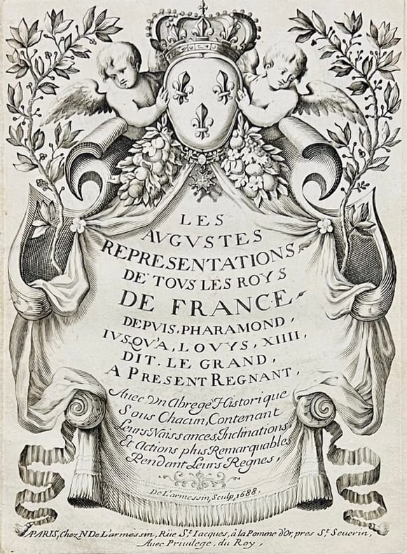 Recueil de portraits gravés par Nicolas de Larmessin précédés du titre gravé à la date de 1688.A la suite des 63 premiers portraits numérotés sont reliés 5 portraits par le même graveur : Louis XIV, Louis Dauphin de France, Louis de France Duc de Bourgogne, Philippe de France Duc d'Anjou, Charles de France Duc de Berry, Nicolas II de Larmessin, dit l'Ancien (1632 -1694), membre de l'une des plus illustres familles de graveurs français du XVIIe et du XVIIIe siècle, était le fils du libraire Nicolas I et de Jeanne Michon. « L'oeuvre de Nicolas II est confondu avec celle de son jeune frère Nicolas III (...) D'ailleurs il n'y a pas de doute possible pour les estampes portant l'adresse de leur auteur ; Nicolas II, l'aîné, demeurait rue Saint-Jacques à l'enseigne de La Pomme d'Or, tandis que son cadet, Nicolas III, habitait la même rue à l'enseigne du Lion Ferré » (Bénézit).Toutes les planches portent l'adresse de Pierre Bertrand, à défaut des sept dernières à l'adresse de son gendre Nicolas de Larmessin.Provenance : Marquise d'Agoult (ex-libris manuscrit), inspiratrice de Choderlos de Laclos pour le personnage de Mme de Merteuil dans les Liaisons dangereuses.