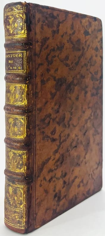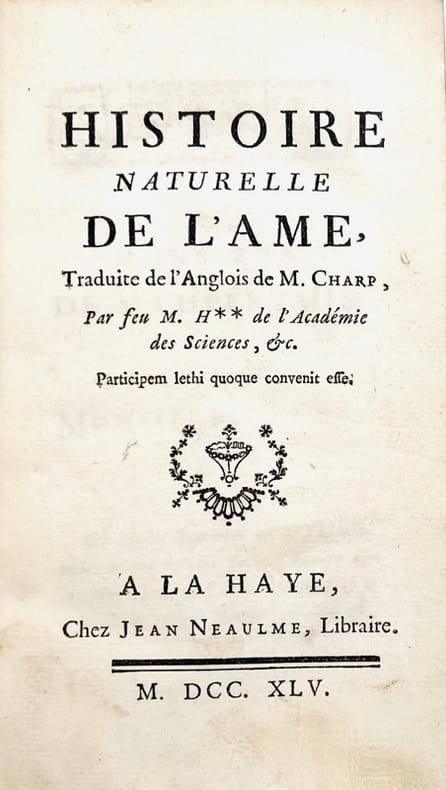 Édition originale d'un des principaux ouvrages philosophiques de l'auteur, dans lequel il expose sa théorie matérialiste de l'âme.Elle est dédiée à Maupertuis, ami de La Mettrie avec lequel il collabora parfois. Sur le titre, la mention : traduit de l'anglois de M. Charp, par feu M. H**, est fallacieuse : l'ouvrage a bien composé et publié en français. Charp est un des pseudonymes de l'auteur et l'initiale H** désigne probablement Hunault, qui avait été son maître à Saint-Malo.Ayant observé, lors d'une maladie qu'il avait contractée, que l'affaiblissement des facultés morales avait suivi celui des organes, La Mettrie en conclut que la pensée n'était qu'un produit de l'organisation. Il publia ses idées dans l'Histoire naturelle de l'âme. L'orage que ce livre souleva lui fit perdre sa place de médecin des gardes. L'Histoire naturelle de l'âme fut saisie et condamnée au feu par le Parlement de Paris le 7 juillet 1746. Coiffe de pied restaurée. Très bon exemplaire.Tchemerzine III, 946 ; Stoddard, n°18.