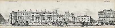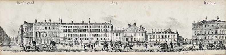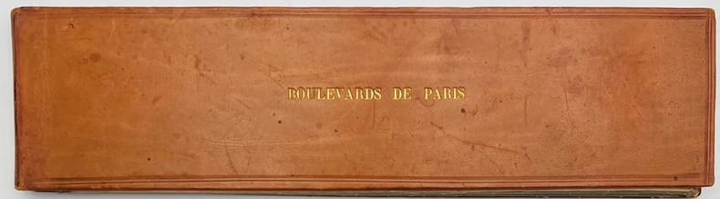 Très beau et rare panorama lithographié représentant le côté sud des boulevards parisiens depuis l'église de la Madeleine jusqu’à la place de la Bastille où l'on distingue la statue monumentale de l'Éléphant de la Bastille qui fut démolie en 1846.20 feuilles montées en accordéon et mesurant plus de 6 mètres de long.L’artiste, resté anonyme, y a représenté de nombreuses scènes de rue ainsi que les théâtres et les lieux de plaisir de l’époque, comme le Gymase dramatique, la poste du Château d'eau, le Cirque olympique, le Spectacle des funambules, le Salon des figures, le Théâtre des Variétes amusantes, etc.Bel exemplaire, bien conservé malgré quelques frottements d’usage et des rousseurs.