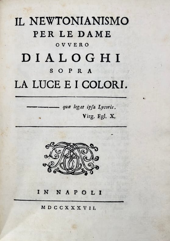 Édition originale de première émission très rare avec le feuillet d'errata.Portrait en frontispice d'Émilie du Châtelet conversant avec Algarotti devant le château de Cirey, gravé par Marco Pitteri d'après Giovanni Battista Piazzetta (1683-1754).Francesco Algarotti fut invité pendant quelques mois chez Voltaire à Cirey tandis qu'il préparait son ouvrage à succès, Le Newtonisme pour les dames (1737). Les entretiens avec Voltaire et Mme du Châtelet servirent de modèle pour les dialogues de son livre qui expose le système newtonien de la lumière et des couleurs sous la forme d'une conversation galante entre une dame et un gentilhomme. Voltaire témoigna chaleureusement de son séjour : « Lorsque j’eus l’honneur d’entendre à Cirey les dialogues italiens de M. Algarotti, dans lesquels les principaux fondements de la philosophie de Newton me paraissent établis avec beaucoup d’esprit, et ceux de Descartes ruinés avec beaucoup de force, je m’engageai de mon côté à combattre en français pour la même cause, quoique avec des armes extrêmement inégales. Je suppliai la personne respectable chez qui nous étions de souffrir que je misse son nom à la tête d’une philosophie qu’elle entend si bien ; et M. Algarotti nous dit que pour lui, puisque son ouvrage était un dialogue avec une marquise supposée et dans le goût de la Pluralité des mondes, il le dédierait à M. de Fontenelle. Je dis à M. Algarotti que j’étais très fâché de voir une marquise en l’air dans son ouvrage, et qu’il ne fallait pas mettre un être imaginaire à la tête de vérités solides. Voilà ce qui donna lieu à ce commencement de mes Éléments, comme la dame illustre à qui ils sont dédiés et M. Algarotti peuvent en rendre témoignage ». Très rare exemplaire de première émission publié à Naples en 1737. L'ouvrage fut mis à l’index dès 1738. Dos refait, gardes renouvelées, quelques pâles rousseurs.