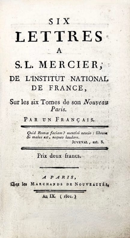 Unique édition, peu commune, de cette critique tatillonne (livre après livre, paragraphe après paragraphe) du Nouveau tableau de Paris, auquel Fortia de Piles, qui avait émigré, reproche finalement, non ses descriptions, mais ses opinions proches de la Révolution.Quérard III, 169. Cioranescu, XVIII, 44 601.Ex-libris manuscrit de Gabriel-Augustin Guys de Saint-Charles (et chiffre G.S.C. poussé en queue du dos), apposé sous la restauration (le signataire se désigne comme "chevalier de Saint-Louis". Ce personnage sur lequel on est très peu renseignés co-écrivit plusieurs productions de Fortia de Piles. Né en 1758 à Marseille (comme Fortia de Piles), il est l'un des fils du négociant et armateur marseillais Pierre-Augustin Guys (1721-1799), beaucoup plus connu, y compris pour ses compositions littéraires.Exemplaire du docteur Maurice Vimont, historien de Paris, avec vignette ex-libris contrecollée sur les premières gardes. Il est surtout connu pour les deux monographies suivantes : Histoire de l'église et de la paroisse Saint-Leu-Saint-Gilles (1932) ; Histoire de la rue Saint-Denis (1936). - - VENTE PAR CORRESPONDANCE UNIQUEMENT
