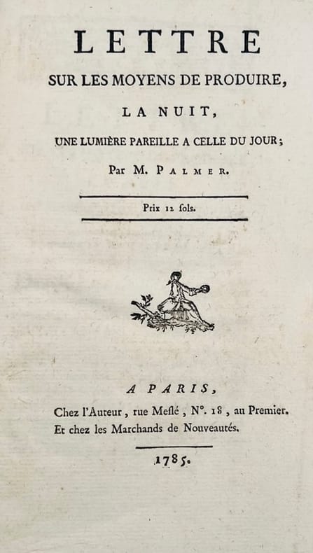 Édition originale. En 1785, le chimiste et verrier anglais George Palmer auteur de Théorie des couleurs et de la vision (1777) fit publier à Paris où il était installé la Lettre sur les moyens de produire, la nuit, une lumière pareille à celle du jour dans laquelle il décrit la modification de l'éclairage des lampes à huile avec un manteau en verre bleu, permettant de se rapprocher de la lumière du jour. « Notant que le vert et le bleu se confondent à la lumière d'une bougie ou d'une lampe ordinaire, George Palmer proposa pour corriger l'illusion un verre bleuté donnant une lumière pareille à celle du jour, ce qui serait spécialement utile aux peintres et artistes travaillant la nuit. Il présenta l'idée à l'Académie des sciences le 4 décembre 1784, soit une semaine avant la lecture par Antoine-Arnoult Quinquet du mémoire sur sa lampe. Le pharmacien qui avait au moins le mérite de reconnaître les bonnes idées chez les autres, se mit avec l'Anglais pour commercialiser des lampes à cheminée bleutée. » (Bruno Belhoste, Paris savant). Conlon 85.1663.