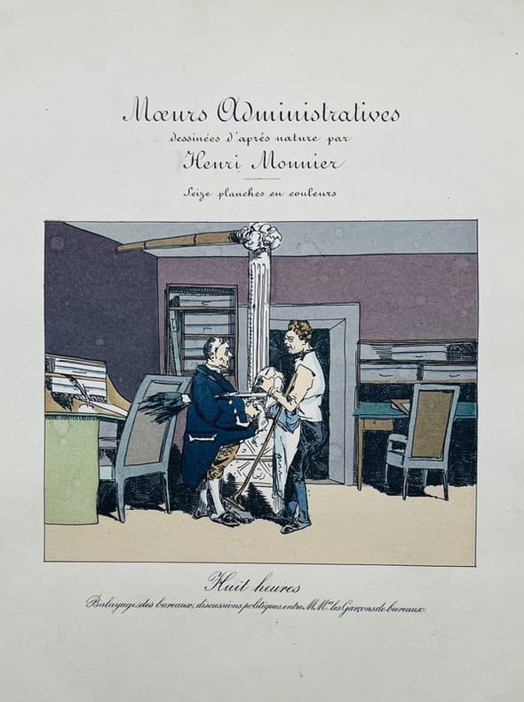 Rééédition pour la revue « Grand Guignol » (n°40, hiver 1927-1928) des deux séries de Moeurs administratives publiées chez Delpech en 1828 dont quatre issues de la première série (Chef de division, Chef de bureau, Employé et Surnuméraire) et la suite complète de douze lithographies de la seconde série éponyme. Relié en tête : portrait lithographié en noir de Monnier entouré de six vignettes (Imp. H. Jannm, vers 1828). Joint : titre original en noir daté 1828 illustré d'une vignette de Henry Monnier. La planche de titre de la réédition n'est pas montée sur onglet. Beraldi, X, p. 97, n°377-383 et 385-396 (premiers tirages de 1828).
