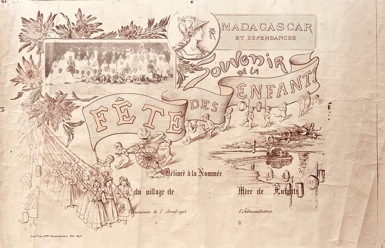 Tananarive, Lithographie du Bureau Topographique (État-Major), 1904. Affiche imprimée en couleurs illustrée d'une reproduction photographique (50 x 32 cm).