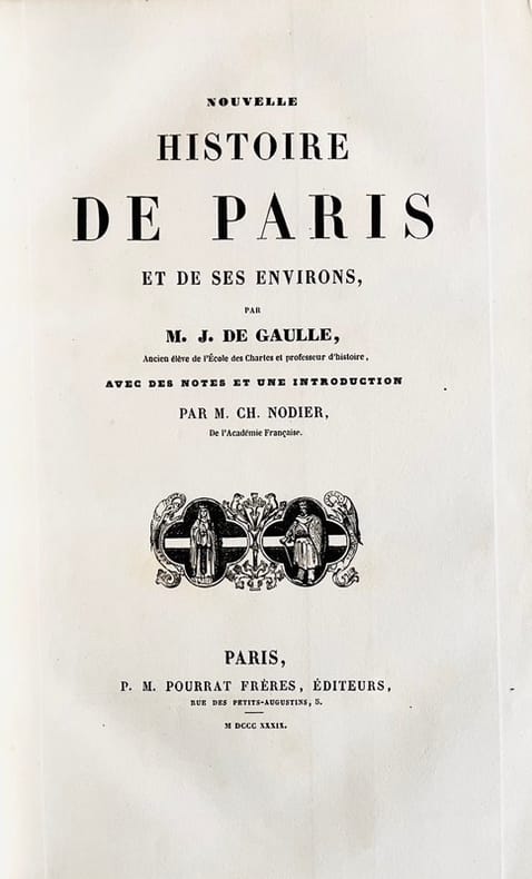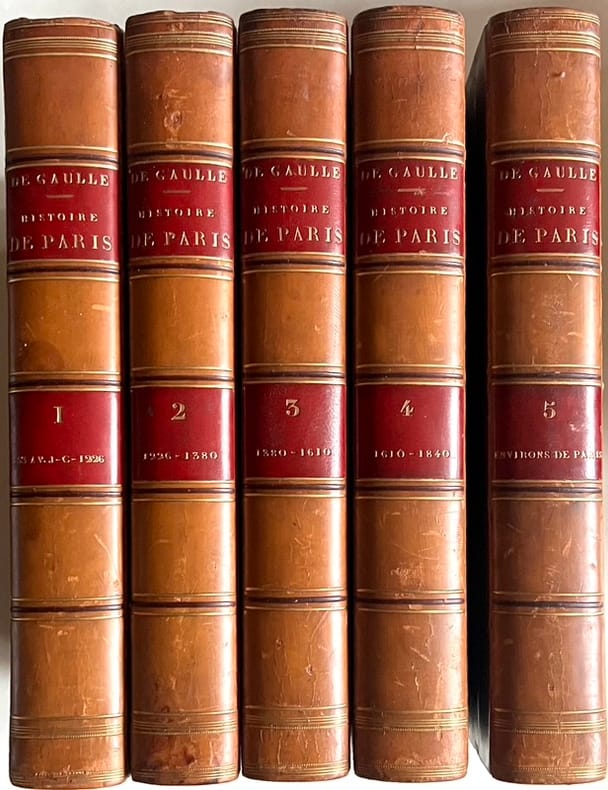 Édition originale. Par le grand-père du général de Gaulle. Une des meilleures histoires de Paris et de ses environs, illustrée de 50 planches gravées et de 2 cartes repliées, dressées et gravées par Pierre Tardieu.Rare complet du cinquième volume. Bossuet et Vicaire ne signalent que les quatre premiers volumes.Bon exemplaire. Quelques menus défauts. Rousseurs.