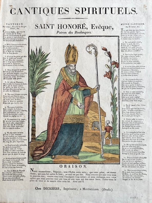 Portrait en pied de saint Honoré gravé sur bois au pochoir, encadrée de texte imprimé sur deux colonnes. Le Saint est figuré en tenue d’évêque, à l’arrière-plan un boulanger et son fournil. Il fut actif principalement à Montbéliard mais également à Porrentruy Théodore-Frédéric Deckherr reprend la librairie et l'imprimerie de son père en 1803, et continue l'activité avec ses frères de 1812 à 1833. Les frères se séparent en 1833 et abandonnent en 1839 l'imagerie populaire. Les productions de Montbéliard utilisent fréquemment la couleur orange minium qui égaient leurs images.