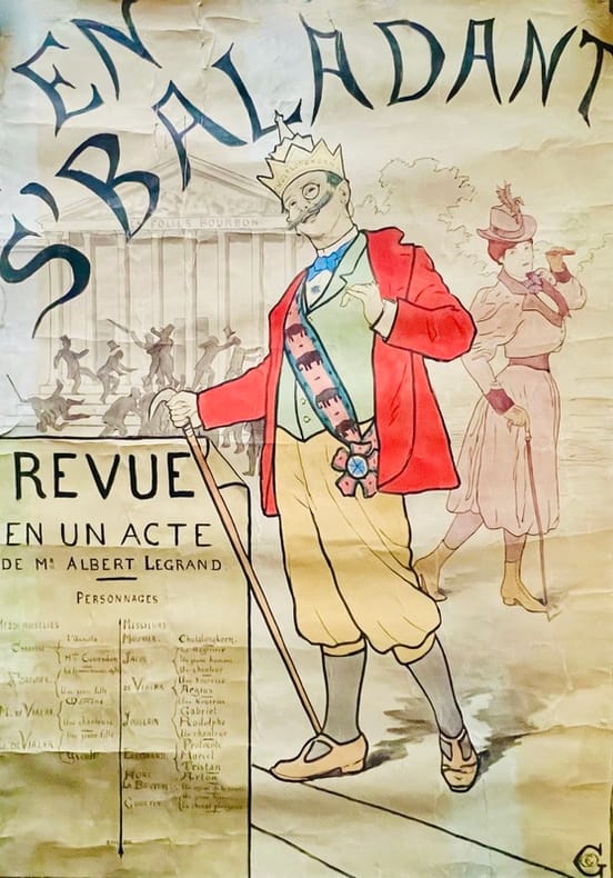 Grand dessin pour cette revue théâtrale accompagnée de sa distribution qui met en scène le 8 février 1898 le roi de Siam Chulalongkorn (1853-1910) en visite officielle en France l'année précédente (1897), représenté en pied devant l'Assemblée Nationale renommée « Les Folies Bourbon ». Affiche signée du monogramme G.E.O. (Géo-Dupuis ?). Petits manques de papier en marge sans atteinte au dessin.