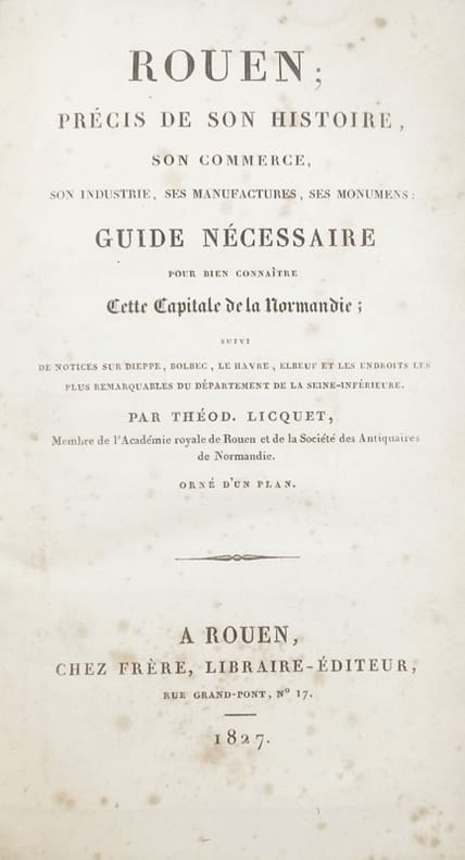 Bien complet de son plan de Rouen en 1826, à double page. Première édition de cet ouvrage qui sera souvent réédité, tirée en 2 formats, in-12 et in-8°, celui-ci dans le plus agréable format in-8°. Isidore (dit François-Théodore) Licquet, né à Caudebec-en-Caux en 1787, est mort à Rouen en 1832. Succédant à Dom Gourdin, il remplit les fonctions de conservateur de la Bibliothèque publique de Rouen. Esprit fin, travailleur infatigable, Licquet s'est livré à des études investigatrices et a publié plusieurs mémoires dans lesquels il redresse certains faits de l'histoire de Normandie acceptés jusqu'alors comme réels. Il avait puisé ses documents à des sources jusqu'alors inexplorées. Bibliographie : Frère, Manuel du bibliographie normand, II, pp. 250-251.