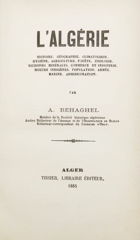 Édition originale. L'Algérie en 1865 vue par le journaliste Arthur-Alexandre Behaghel (1833-1888) membre de la Société historique algérienne. Provenance : Charles Cousin-Montauban, comte de Palikao (ex-libris armorié), né le 24 juin 1796 à Paris où il est mort le 8 janvier 1878 , général et homme d'État, grand-croix de la Légion d'honneur et médaillé militaire. Gay, 861