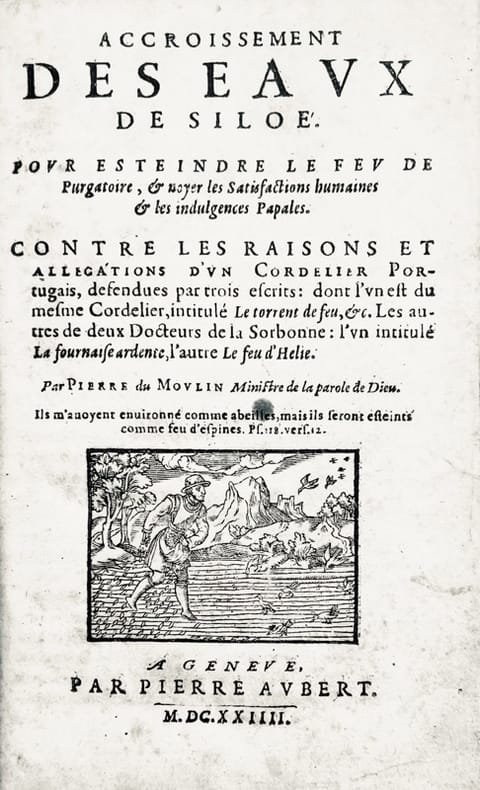 1. Réponse publiée une première fois en 1604 du ministre protestant Pierre Du Moulin (1566-1656) aux trois réfutations de son ouvrage « Eaulx de Siloë pour éteindre le Purgatoire » dans lequel il niait l'existence de celui-ci - du franciscain portugais Jacques Suarez de Sainte-Marie Torrent de feu (1603), Pierre Victor Palma Cayet La Fournaise ardente (1603) enfin André Duval Feu d'Hélie pour tarir les eaux de Siloë (1603). Vignette gravée au titre. Desgraves, 3209. 2. Nouvelle édition publiée une première fois en 1607, trois ans avant l'Anticoton, le fameux pamphlet attribué avec d'autres à Pierre Du Moulin, dirigé en 1610 contre la Compagnie de Jésus et particulièrement contre son représentant à la cour, le Père Pierre Coton (1564-1626) confesseur et conseiller d'Henri IV et de Louis XIII. Vignette gravée au titre. Desgraves 777 (édition 1607). « Athlète intrépide et infatigable du calvinisme pur, Dumoulin soutint d'ardentes controverses, non seulement contre maints docteurs catholiques, mais contre plusieurs de ses coréligionnaires qui s'éloignaient sur quelques points des doctrines proclamées par la confession de foi. Dans toutes ces disputes, il déploya un grand zèle pour les intérêts de son Église et une activité sans égale ; mais on doit regretter qu'il ne se soit pas toujours tenu dans les bornes « de l'honnesteté et de la courtoisie » et que souvent, au contraire, il se soit laissé emporté beaucoup trop loin par l'impétuosité de son caractère » (Haag). Bel exemplaire. Feuillets roussis.