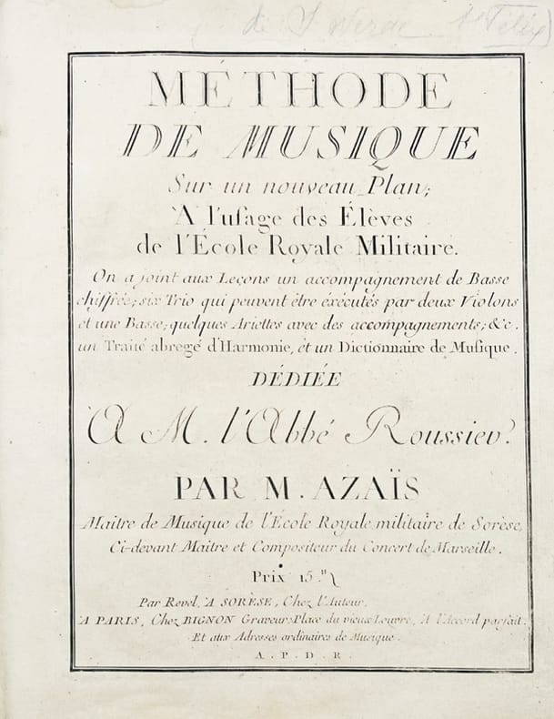 Édition originale entièrement gravée « par Revel à Sorèse » dédiée à l'abbé Pierre Joseph Roussier (1716-1792) « chanoine d'Écouis, auteur de divers ouvrages sur la musique ».Théorie musicale de Hyacinthe Azaïs qui comprend : Solfèges (p. 22-97), Trios (p. 98-120), Ariettes (p. 121-132). Maître de musique de l'École Royale militaire de Sorèze et compositeur du Concert de Marseille, Hyacinthe Azaïs (1741-1796) qui s'était consacré à l'enseignement de la musique religieuse, composa plusieurs sonates pour violoncelle. Il est le père de l'auteur des Compensations dans les destinées humaines, Hyacinthe Azaïs (1766-1845).Provenance : « Severac de St Félix » (ex-libris manuscrit à l'encre du temps) accompagné d'une note au crayon postérieure : « A appartenu à notre grand-mère Rose Honorée de Juge de Brassac Baronne de Séverac » aïeule du compositeur Déodat de Séverac (1872-1921) qui fit ses études à Sorèze, Toulouse, puis à la Schola Cantorum de Paris ; profil d'un jeune homme dessiné pleine page au crayon noir sur un feuillet de garde en fin d'exemplaire.