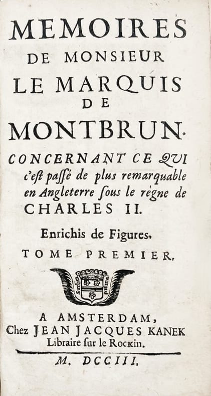L'illustration comprend 11 figures hors texte dont le portrait du marquis de Montbrun en frontispice et une planche consacrée au jeu de paume (tome 1 p. 150). Roman historique composé par l'écrivain à succès Gatien de Courtilz de Sandras (1644-1712), ces mémoires fictifs vont jusqu'en 1632 quand Alexandre Du Puy Montbrun (1600-1673) chef de guerre protestant, opposé aux armées royales au début du règne de Louis XIII, était officier au service de Venise, de Gustave-Adolphe de Suède puis du duc de Saxe-Weimar. « Fils d'un pâtissier, mais persuadé d'être le bâtard du duc de Bellegarde, Montbrun fréquente le collège de Navarre, y apprend à duper son prochain, s'enfuit après une incartade libertine en Angleterre où il fait fortune grâce à sa science du jeu de paume et des paris. Après avoir échappé de peu à un mariage infamant, il retourne en France où, enfin reconnu par un père en mal d'argent, il assiste aux dernières velléités de résistance des princes frondeurs... Si l'intérêt se soutient avec peine au fil d'une trame sciemment décousue, la « vision d'en bas sur l'histoire » (R. Démoris) que propose Courtilz témoigne du prestige nouveau de la fiction. L'amalgame de la grande et de la petite histoire est particulièrement frappant dans la 3e partie du roman où, sur fond de « Grande cabale », père et fils poursuivent leur étrange roman familial. En annexe et en contrepoint du roman, est reproduite l'« Historiette » que Tallemant des Réaux consacra au même héros, d'un très réjouissant prosaïsme. » (Jean-Christophe Abramovici).Troisième édition publiée deux ans après l'originale (1701). Très bon exemplaire en reliure d'époque, discrètement restaurée. Le faux-titre manque (tome 1).Bourgeois, André, 725 ; Quérard II, 318.