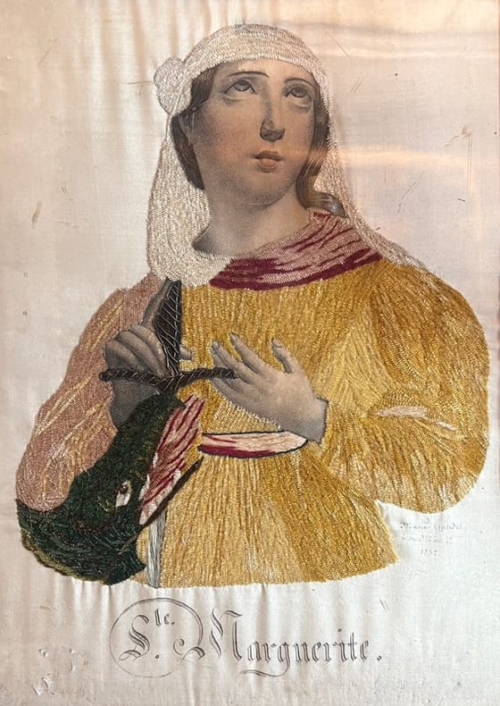 Portrait textile habillé de reps multicolore signé et daté « Maria Gundel à sa Mère 1857 » représentant Sainte Marguerite et le dragon vénérée à Paris dans l'église Saint-Germain-des-Prés près de laquelle la cour du Dragon avait un portail à sa mémoire.« Lorsque l’on parle d’estampes habillées on pense en premier lieu aux gravures de mode, peintes et ornées de morceaux de tissus découpés, le sujet de l’estampe semblant appeler naturellement un tel traitement. Mais tout aussi nombreuses sont les gravures à sujet religieux qui ont été habillées à la fin du XVIIe et au XVIIIe siècle, à commencer par les estampes en taille-douce parisiennes représentant d’élégantes scènes de la vie du Christ ou de la Vierge et des saints d’après des peintres comme Charles Le Brun, Pierre Mignard, Nicolas Loir, Antoine Dieu, Jean-Baptiste Corneille, Antoine Coypel, etc., éditées le plus souvent par les Bonnart, Mariette, Bazin, Poilly, Chiquet ou Chéreau, ainsi que par le Lyonnais Gentot, spécialiste des découpures, qui avait une succursale à Paris. [...] Bien que les images de dévotion représentent une part importante de la production des gravures habillées au XVIIe comme au XVIIIe siècle, il est certain que d’autres sujets ont bénéficié de cet enrichissement. Citons en particulier des œuvres profanes, dont certains portraits de souverains et personnages de la cour, de comédiens et de personnages de théâtre, sans oublier des scènes de genre » (Les « estampes habillées » : acteurs, pratiques et publics en France aux XVIIe et XVIIIe siècles, Pascale Cugy, Georgina Letourmy-Bordier et Vanessa Selbach).Beau travail de dévotion signé et daté, conservé dans son cadre d'origine (petits manques de dorure).
