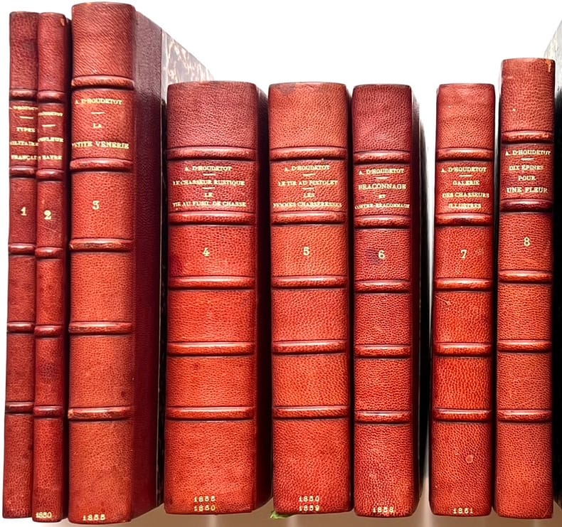 Types militaires français. Paris, chez les principaux libraires, s.d.Honfleur & Le Havre. Huit jours d'une royale infortune. Paris, au dépôt de la libraire, 1850.La Petite vénerie. Paris, au dépôt de la librairie, 1855.Le Chasseur rustique. Paris, Charpentier, 1855.Le Tir au fusil de chasse. Paris, Charpentier, 1860.Le Tir au pistolet. Paris, au dépôt de la librairie, 1850.Les Femmes chasseresses. Paris, Charpentier, 1859.Braconnage et contre-braconnage. Paris, Charpentier, 1855.Chasses exceptionnelles. Galerie des chasseurs illustres. Paris, Charpentier, 1861.Dix épines pour une fleur. Paris, Croissant, s.d.Provenance : bibliothèque du baron de Nervo avec ex-libris sur chaque volume.