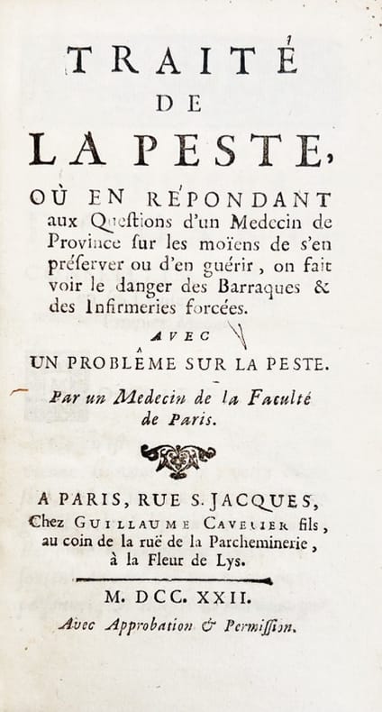 Édition originale du traité sur la peste de Philippe Hecquet (Abbeville 1661 - Paris 1737) qui signe l'épître : « (…) j'ose vous présenter, Monsieur, les différentes méthodes de traiter cette maladie (…) je n'ai point craint de conserver à la saignée la valeur que lui ont donné les grands auteurs qui l'ont pratiqué avec succès dans la peste. » À l’époque, on pensait que la peste était provoquée par des miasmes, des vapeurs putrides rendues délétères en raison de la position des astres. Proche des jansénistes, médecin des princes et médecin des pauvres, Hecquet vivait très sobrement, mangeant peu et ne buvant que de l'eau. Champion de la saignée, il ne manque pas de s'attirer les satires et aurait inspiré à Lesage le personnage du docteur Sangrado (saignée en espagnol) de Gil Blas, et celui de Hocquetos. Provenance : Raymond Decary (ex libris) ethnologue et géographe, spécialiste de Madagascar (1891-1973) ; cachet « Alain Weiss Ingénieur ». Très bon exemplaire en reliure d'époque.Waller, 4179 ; Blake 202.