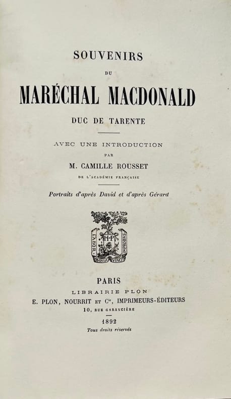 Étienne Jacques Joseph Alexandre Macdonald, 1er duc de Tarente, né le 17 novembre 1765 à Sedan (Ardennes) et mort le 25 septembre 1840 dans son château de Courcelles-le-Roy, à Beaulieu-sur-Loire (Loiret), est un général français de la Révolution et un maréchal d'Empire. Merci de nous contacter à l'avance si vous souhaitez consulter une référence au sein de notre librairie.