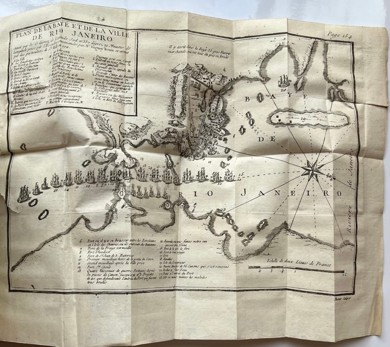 Nouvelle édition des mémoires d'un des plus illustres corsaires du XVIIIe siècle, René Duguay-Trouin (1673-1736) ; on y trouve le récit de son expédition au Brésil (1711). Table alphabétique de quelques termes de marine et une liste des noms et grades des officiers embarqués dans les vaisseaux commandés par Duguay-Trouin de 1702 à 1709 et en 1722 ainsi que du dénombrement des équipages. un portrait en frontispice (gravé par de Larmessin), 6 planches dépliantes hors texte (3 planches sont signées du graveur Le Bas, le « plan de la baye et de la ville de Rio-Janeiro » est dessiné et gravé par A. Coquart, 2 planches ne sont pas signées). Bon exemplaire. Une coiffe usée. Polak, 2855.