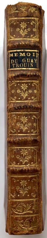 Edition rouennaise des mémoires de Du Guay-Trouin (1673-1736) augmentée de son "éloge" par M. Thomas. Ses Mémoires, écrites sur le ton de la simplicité font peu de cas de tourner les événements à son avantage. Il n’hésite pas à faire part régulièrement de ses doutes et de ses faiblesses avec une étonnante sincérité, ce qui est rare dans les mémoires de cette époque, souvent marquées par des formules alambiquées et hyperboliques. L'ouvrage, qui fourmille d’anecdotes, offre aussi un précieux témoignage sur la marine de la fin XVIIe - début XVIIIe siècle, tant sur la navigation, que la vie à bord et le combat naval. On trouve à la fin des mémoires un état des officiers-majors, et des équipages des vaisseaux du Roi, commandés par M. Du Guay-Trouin de 1702 à 1709 et une liste des offciers de marine pour l'expédition de Rio-Janeiro en 1711.