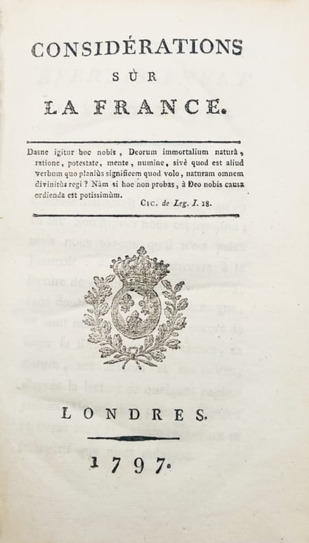 Édition originale publiée en réalité à Bâle en 1797 ; c'est à tort que Vicaire donne la première édition datée 1796.Les 2 premières pages portent le faux-titre et le titre ; les pages 241-246 sont paginées par erreur 236-242. Bandeau, culs-de-lampe, illustration au titre.« Les Considérations sur la France paraissent en 1797. Pour la première fois, les victimes de la Révolution parlent, non pour gémir ou insulter, mais pour comprendre ce qui s'est passé et aussi pour envisager l'avenir probable. Joseph de Maistre est le premier à ne pas critiquer la Révolution pour l'une ou l'autre de ses mesures ou pour ses " excès ", mais à la rejeter tout entière, dans son principe, comme contraire à la nature même de l'homme, création de Dieu. Bien plus,. il met en évidence l'irrésistibilité de ce gigantesque chambardement et son caractère paradoxalement quasi " sacré ". La Révolution serait ainsi une punition du Ciel car rien n'est le fruit du hasard. Un texte essentiel pour comprendre la perception de la Révolution par la réaction » (Pierre Manent).Bel exemplaire. Réparation au dernier feuillet ; sans le dernier feuillet blanc.Monglond, La France révolutionnaire et impériale, IV, 6-11 ; Vicaire V, 459.