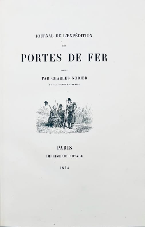 Edition originale illustrée de 40 gravures sur bois hors-texte tirées sur Chine avec serpentes légendées, et de 153 vignettes dans le texte, par Raffet, Dauzats et Decamps. Cette relation de l’expédition du duc d’Orléans en Algérie, du 19 Septembre au 2 Novembre 1839, fut rédigée par Nodier à partir des notes du journal de campagne du duc. L’expédition se rendit à Oran, Alger, Bougie, Philippeville, Constantine, le passage par les Portes de Fer n’occupant que quelques pages du récit. Le duc d’Orléans fut tué accidentellement le 13 juillet 1842 à l’âge de 32 ans. Charles Nodier termina l’ouvrage et y mettait les touches finales quand il succomba à son tour. Cet ouvrage, non mis dans le commerce, était destiné aux membres de la famille royale, aux personnages de l'Etat, aux dignitaires de la cour, aux officiers, sous-officiers et soldats ayant pris part à l'expédition. Exemplaire sans rousseurs, à grandes marges. Petits frottements à la reliure. Vicaire VI,142.