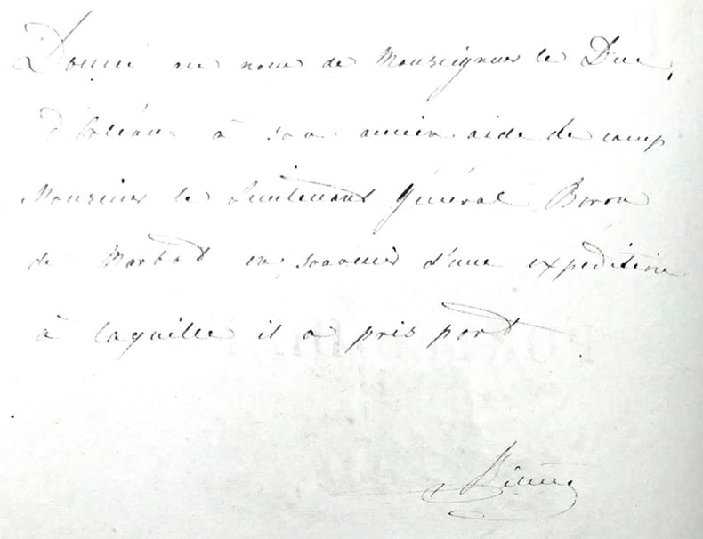 Édition originale et premier tirage des illustrations.Une carte repliée de l'Algérie, environ 200 vignettes sur bois dans le texte et 40 figures sur bois tirées sur Chine, par Raffet, Descamps et Dauzat. Chacune de ces gravures est protégée par une serpente portant une légende imprimée.L'ouvrage tiré à petit nombre, était destiné aux membres de la famille royale, aux personnalités de l'État et aux compagnons d'armes ; il n'a pas été mis dans le commerce.Provenance : bibliothèque du baron de Marbot (ex-libris).Ex-dono autographe au verso du faux-titre : « Donné au nom de Monseigneur le Duc d'Orléans à son ancien aide de camp Monsieur le lieutenant général Baron de Marbot en souvenir d'une expédition à laquelle il a pris part » avec cette annotation : « Les lignes ci dessus sont écrites et signées de la main de la duchesse d'Orléans ».Carteret III, 434 ; Vicaire VI, 140.