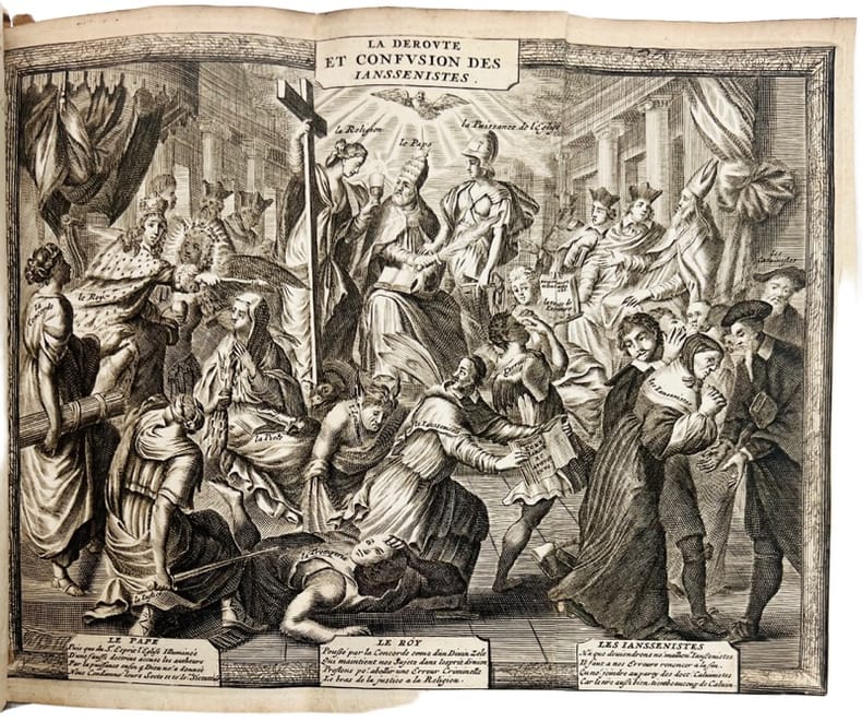 Contrefaçon légeoise de l'édition de 1654. Pamphlet en vers contre les jésuites.La grande planche dépliante « Déroute et confusion des Jansénistes" » est une copie de la planche d'Abraham Bosse ; suivi de la planche illustrant l'« Onguant sur la brûlure ».Jean Barbier d'Aucour (1641-1694), avocat au Parlement de Paris , fut un auteur satirique favorable aux jansénistes ; il publiait aussi sous le pseudonyme Jean-François de Bonne-Foy. Membre de l'Académie française (élu en 1683).Ex-libris armorié gravé du XVIIIe siècle ; Ex Musaeo Ing H. Busquet.Inventaire du fonds français XVIIe siècle, Bosse (Abraham), n°219.