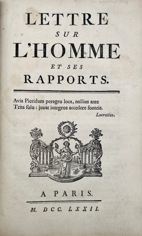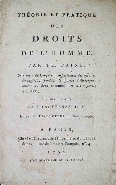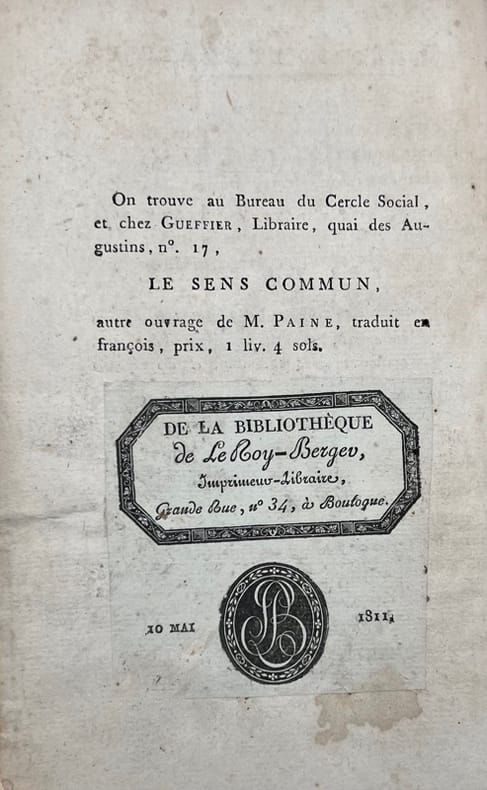 Nouvelle traduction établie par le député à la convention nationale François Lanthenas, de la seconde partie seule des Droits de l'homme de Thomas Paine, publiée sans l'épître dédicatoire à La Fayette ni la préface de l'auteur. On peut lire à ce propos dans l'avis placé en tête d'ouvrage : « cet écrivain a été obligé, par les préjugés qui gouvernent encore ce peuple (anglais), de descendre jusqu'à répondre à Burke. Il l'a, surtout, fait dans une longue préface, qui n'est qu'une pièce polémique, très-fastidieuse. (…). on a donc cru que ce serait faire injure aux Français libres, que de la traduire : et des raisons semblables ont engagés les éditeurs à supprimer encore une épître dédicatoire adressée par Paine à Lafayette. (…) » Le commandant de la Garde nationale était tombé en disgrâce depuis l'affaire du Champ-de-Mars. Rights of Man, being an answer to Mr. Burke's attack on the French Revolution (London, for J.S. Jordan, 1791) fut écrit en réponse aux Réflexions sur la révolution en France de Burke (publiées en 1790), qui soutenait le rôle de la religion dans le maintien de l'ordre social et désapprouvait le renversement passionné d'institutions séculaires en France. La deuxième partie de l'ouvrage fut publiée en 1792. Paine s'attaquait désormais à presque tous les niveaux de la société, mais surtout à la monarchie et à l'aristocratie. Il s'opposait à toute forme de privilège et estimait que l'État devait aider les moins fortunés en leur offrant une éducation gratuite, des pensions et même des allocations de maternité. Paine pensait qu'une société plus égalitaire serait une société moins corrompue, car il notait que « là où il n'y a pas de distinctions, il ne peut y avoir de supériorité; l'égalité parfaite n'offre aucune tentation » (Robertson, 715). Pour ce faire, il souhaitait supprimer les titres de noblesse et la Chambre des Lords en Angleterre avec ses législateurs dont la seule qualité était d'avoir été législateur de père en fils. Selon Paine, les monarques disposaient d'un ensemble de compétences tout aussi limité pour occuper leur position de pouvoir. Les idées de Paine sur la réforme électorale étaient encore plus radicales. Paine proposait que tous les hommes aient le droit de vote. Il soutenait que « tout droit civil découle d'un droit naturel, qui ne doit jamais être envahi par des autorités dont la seule fonction est de le renforcer » (Yolton, 459). Les opinions radicales de Paine l'obligèrent à quitter l'Angleterre, sous peine d'être jugé pour trahison. La première édition française complète (première et seconde parties) fut établie par François Soulès sous le titre Droits de l’homme ; en réponse à l’attaque de M. Burke sur la révolution françoise (Paris, Buisson et Testu, Mai 1791, 1792).Reliés à la suite : HEMSTERHUIS (Frans). Lettre sur l'Homme et ses rapports. Paris, 1772. In-8 de 68, pp. Rare et unique contrefaçon à la date et à l'adresse de l'édition originale de la Lettre sur l'Homme et ses rapports de François Hemsterhuis (1721-1790) surnommé « le Platon hollandais » qui entendait réfuter le Système de la Nature de d'Holbach et démontrer que « la raison seule (…) ne saurait jamais nous mener aux systèmes de matérialisme et de libertinage ». Conlon 72.852 ; Roger Stoddard, A Bibliographical List of Books by François Hemsterhuis (1721-1790) (The Book Collector 2001, 189-201), n°4b. Pâle mouillure. Florian (Jean-Pierre Claris de). Éliézer et Nephtaly, poème traduit de l'hébreu, ouvrage posthume de M. de Florian. - Dialogue entre deux chiens, nouvelle imitée de Cervantès (Paris, Guillemine, 1802). In-8 de 156 pp. Extrait des Oeuvres posthumes de M. de Florian.Provenance : Désiré Le Roy-Berger : « Bibliothèque de Le Roy-Berger imprimeur-libraire, 10 mai 1811 » (étiquette au verso du titre). Quérard, VI, 646.